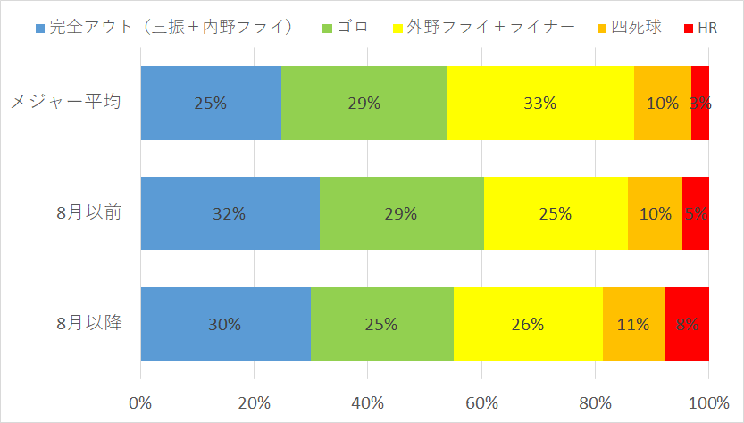 8月以前の大谷は完全アウトもゴロも多い打者であった。しかし、8月以降はゴロを大幅に減らし、完全アウトとゴロを足した数値はメジャー平均と同程度まで改善した。このデータからもわかるように、三振の数よりも「ゴロ打球を打たない事」が大谷にとっての調子のバロメーターとなるのだろう。