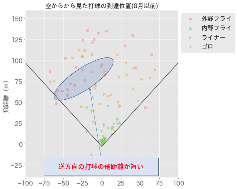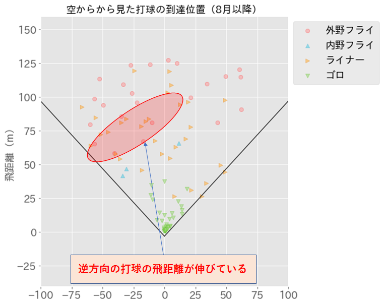 8月以前はレフト方向の打球は50~75mの外野フライが多く、長打や本塁打になりにくかった。しかし、8月以降はその浅い外野フライが減り、レフト方向にも飛距離の大きな外野フライを打てている。フライ打球の打球速度が高まったことで結果的に飛距離が伸び、長打が増えたのであろう。