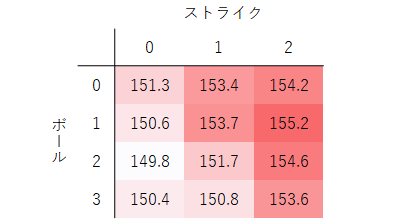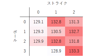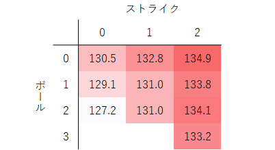 4シームの割合がグッと上がります。さらに、球速も、初球に比べて3km/hも上昇します。ホップ成分の大きいボールで空振りを奪いたい意図が見えてきます。