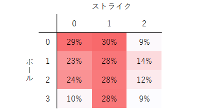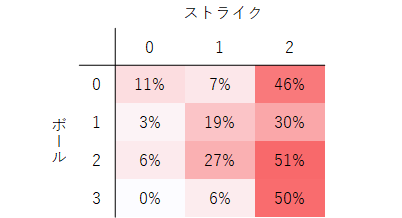 一方で、追い込んでからは、その割合が減っており、この傾向は対右打者とは異なっています。特に2-2では、4シームの投球割合が27%と極端に減っており、別の球種を選択していることが見て取れます。