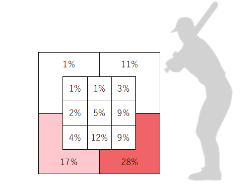 投球割合は32%と、平均よりも若干割合は低くなっていますが、初球では最も多く投げる球種となっています。