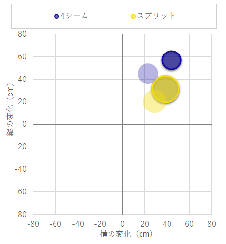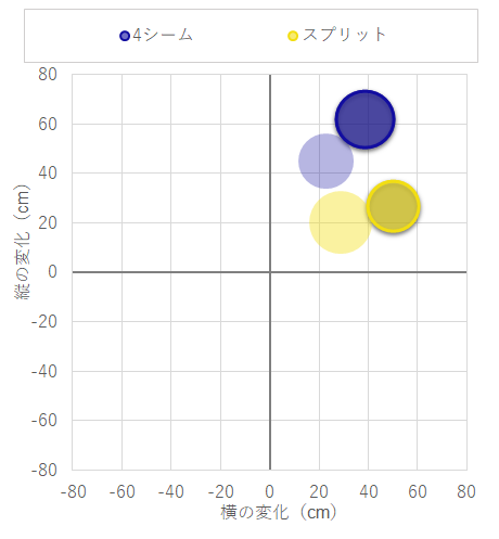 スプリットは昨シーズンよりも落差が減っています。4シームのシュート成分が増加していることから、球が抜けないように抑え気味に投球しているのが原因かもしれません。特に右打者に対しては落差の減少が顕著です。