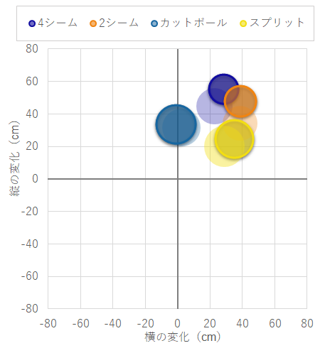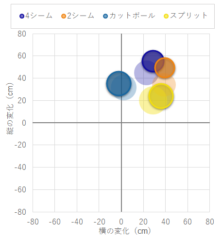 | 球種 | スピンレート(rpm) | 縦の変化量(cm) | 横の変化量(cm) |