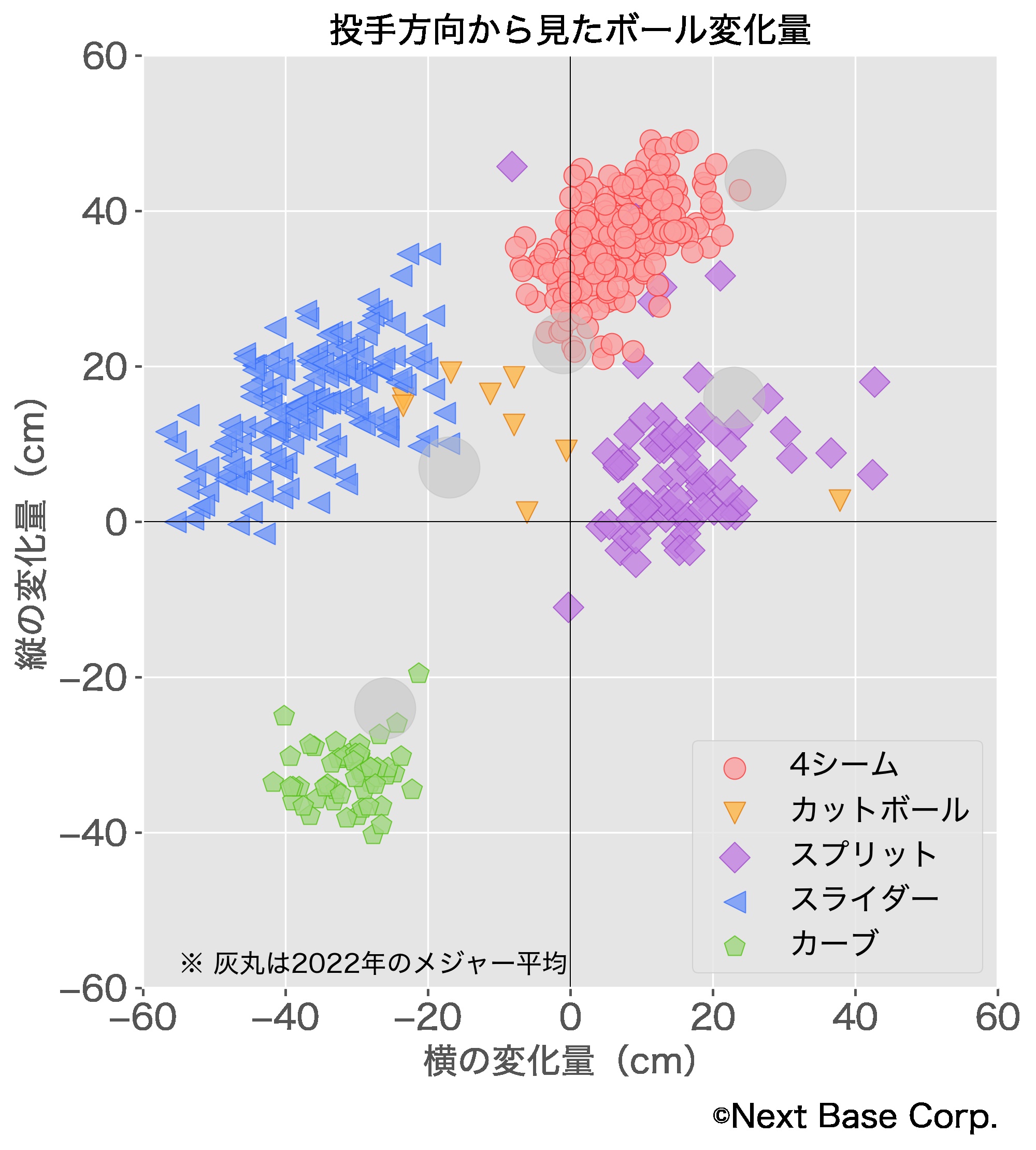大谷の変化量の特徴として、カット気味に動く4シーム・メジャー平均に比べて大きく横に曲がるブーメラン系のスライダーが挙げられる。各球種のボール変化量を昨シーズンのものと比較すると、大きな差異がないことがわかる(図1・2)。しかし、変化量を維持しつつ、球速が昨シーズンよりも速くなっているため、打者はより判断が困難になるだろう。