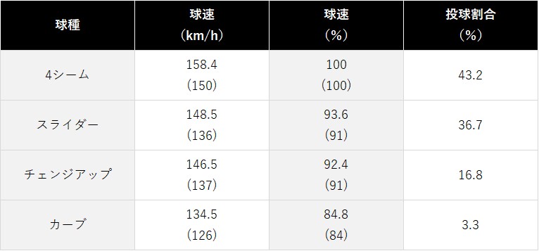 表1 球種別の球速と投球割合。4シームの平均球速がトップクラス