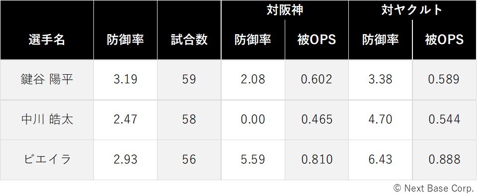 リリーフ投手をみると、鍵谷陽平、中川皓太、チアゴ・ビエイラ、高梨雄平、畠世周の5人が50試合以上に登板していた(表2)。注目すべきは、中川の対阪神の成績だ。防御率0.00(14試合13.1回)を誇っており相性は抜群だ。一方、対ヤクルトの成績はヤクルトの打線が活発なこともあり、どの投手もあまり振るわない。ファイナルステージに進出できた場合、どのような投手起用がされるか注目だ。