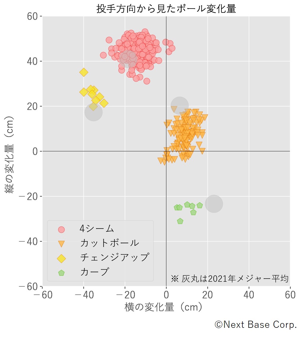 次に、ボール変化量をみていく(図3)。4シームは、球質のバラつきが大きくなってしまっている。メジャー平均よりホップ成分が大きく、伸びるようなボールになっている。高めに投げることで空振りを奪っていきたい。