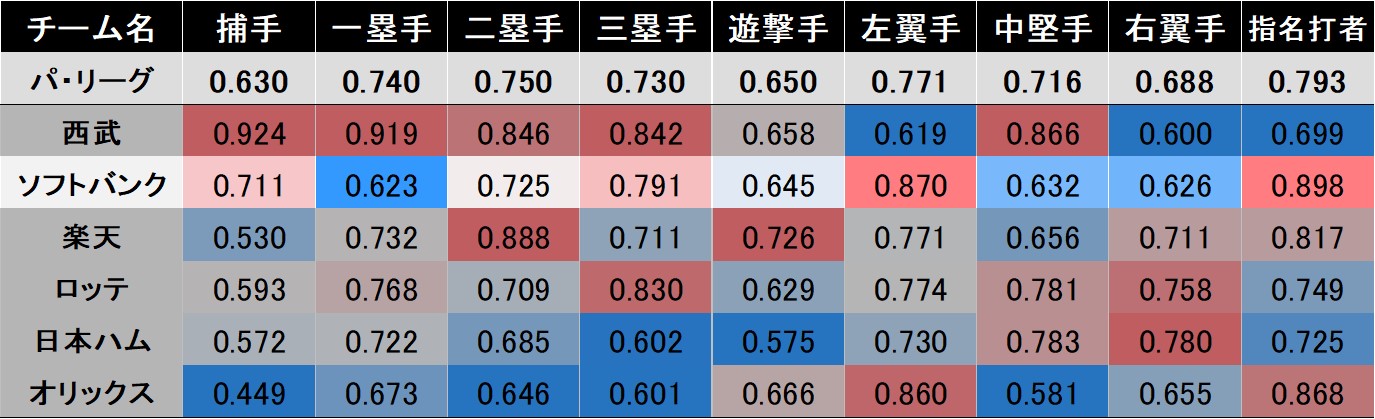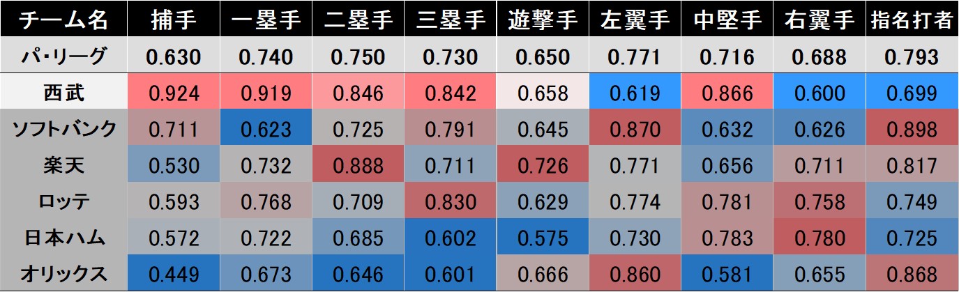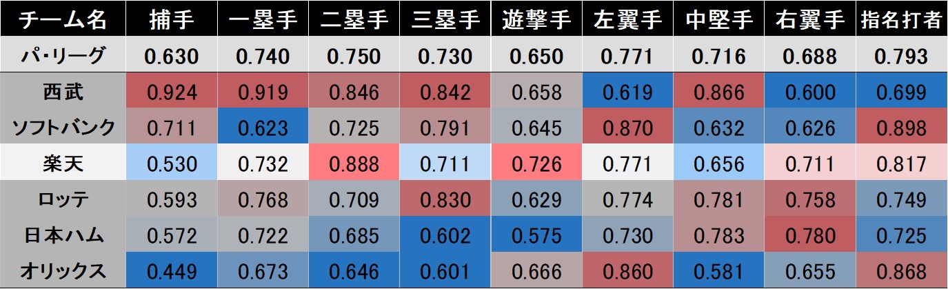 西武は6つのポジションにてリーグ平均以上のOPSを記録し、うち4つはリーグトップであった。ソフトバンク・楽天は4つのポジションでリーグ平均以上のOPSを記録し、それぞれ2つのポジションのOPSがリーグトップであった。9つのポジションにおいて、どれだけ強みを作れるかがチームの得点力や勝敗に関わっているといえるだろう。