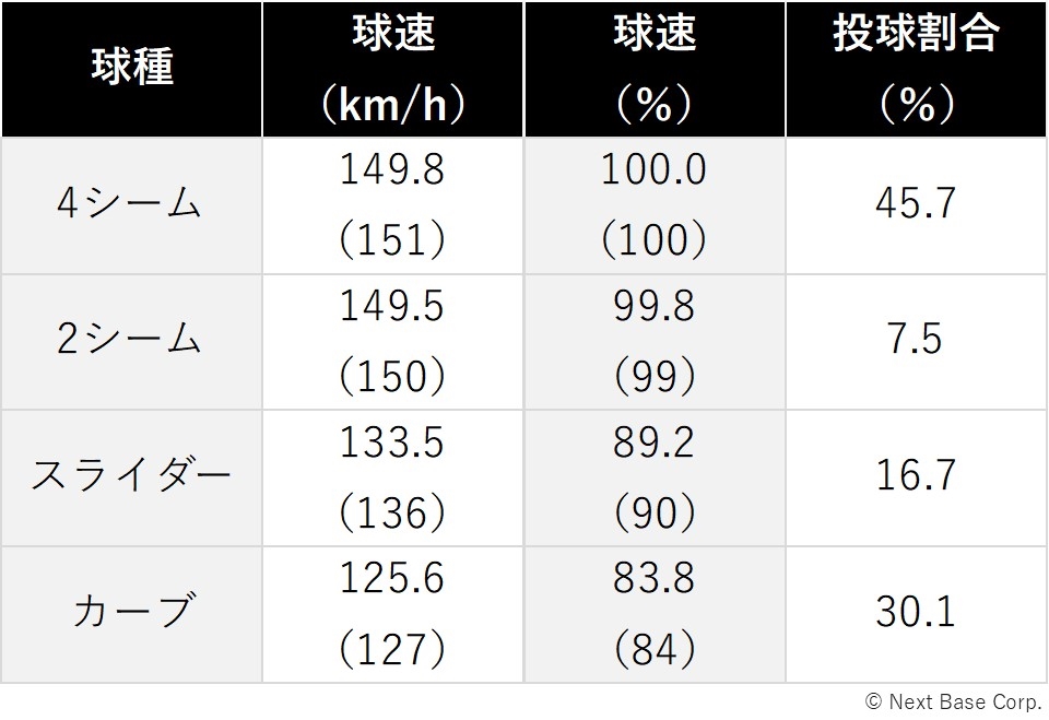 まず、平均球速と投球割合をみていく(表1)。4シームや2シームといった速球系の球速はメジャー平均を少し下回っているが、プロ野球では速い部類だろう。球速比はどの球種もメジャー平均ほどで、突出したボールはなかった。投球割合をみると、4シームが半分弱を占めており投球の中心となっている。次いで、カーブ・スライダー・2シームを投球している。